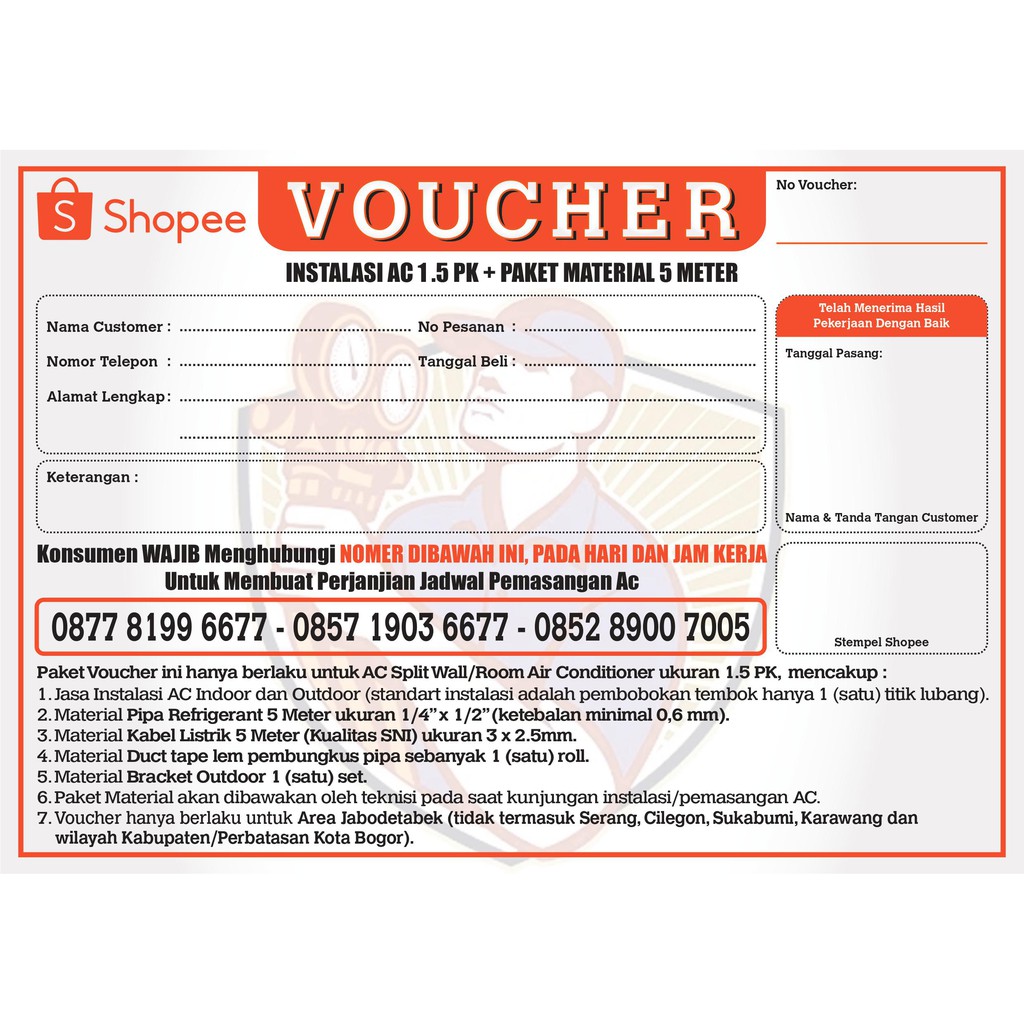 | Deskripsi | Paket Voucher ini hanya berlaku untuk AC Split Wall/Room Air Conditioner ukuran 1.5 PK, mencakup : 1. Jasa Instalasi AC Indoor dan Outdoor (standart instalasi adalah pembobokan tembok hanya 1 (satu) titik lubang). 2. Material Pipa Refrigerant 5 Meter ukuran 1/4” x 1/2” (ketebalan minimal 0,6 mm). 3. Material Kabel Listrik 5 Meter (Kualitas SNI) ukuran 3 x 2.5mm. 4. Material Duct tape lem pembungkus pipa sebanyak 1 (satu) roll. 5. Material Bracket Outdoor 1 (satu) set. 6. Paket Material akan dibawakan oleh teknisi pada saat kunjungan instalasi/pemasangan AC. 7. Voucher hanya berlaku untuk Area Jabodetabek (tidak termasuk Serang, Cilegon, Sukabumi, Karawang dan wilayah Kabupaten/Perbatasan Kota Bogor).*Syarat Dan Ketentuan Pemakaian Voucher Instalasi AC: 1. Voucher instalasi AC hanya dapat digunakan untuk AC jenis Split Wall/Room Air Conditioner sesuai dengan ukuran AC 1.5 PK, berlaku untuk daerah Jabodetabek (tidak termasuk Serang, Cilegon, Sukabumi, Karawang dan wilayah Kabupaten/Perbatasan Kota Bogor). 1 (satu) lembar Voucher hanya berlaku untuk 1 (satu) unit AC atau 1 (satu) kali instalasi. 2. Setelah melakukan transaksi/pembelian, Voucher akan dikirim ke alamat Konsumen, dan konsumen diharuskan untuk menghubungi Hotline Instalasi AC ( 0877 8199 6677 – 0857 1903 6677 – 0852 8900 7005 ), untuk membuat perjanjian jadwal kunjungan instalasi AC. 3. Lembaran Voucher harus diserahkan kepada teknisi. Tanpa adanya lembaran Voucher, maka teknisi berhak untuk tidak melakukan instalasi/pemasangan AC. 4. Instalasi akan dilakukan paling cepat 1 (satu) hari setelah: a. Konsumen menghubungi Hotline Instalasi AC. b. Voucher dan unit AC telah berada di lokasi (siap untuk di instal). 5. Voucher hanya berlaku maksimal 1 (satu) bulan dari tanggal transaksi/pembelian. Lewat dari itu maka Voucher menjadi tidak berlaku/hangus. 6. Voucher yang telah dibeli tidak dapat dikembalikan dan tidak dapat dibatalkan dengan alasan apapun. 7. Standart pekerjaan instalasi AC dilakukan dengan pembobokan tembok hanya 1 (satu) titik lubang untuk jalur/saluran pipa dari Indoor ke Outdoor, tanpa adanya perapihan, penambahan material lainnya serta peralatan khusus. 8. Pekerjaan/jasa instalasi AC tidak termasuk : a. Bongkar dan pasang AC lama b. Pengelasan/penyambungan pipa gas dan penambahan freon (jika dibutuhkan). c. Pembobokan tembok untuk penanaman pipa gas, saluran pembuangan air dan kabel. d. Instalasi sumber listrik/Power Supply dan Drainase/saluran pembuangan air. e. Perapihan/penambahan dinding dan plafon, termasuk yang timbul dalam proses intalasi. f. Biaya tambahan akibat adanya permintaan/lokasi yang sulit (misalnya sewa steger). 9. Jika ada penambahan material atau jasa pekerjaan lainnya, maka akan dikenakan tambahan biaya yang langsung dibayarkan kepada teknisi. 10. Khusus untuk lokasi yang dikelola oleh pihak ketiga/pengelola properti (Apartement, Perumahan Cluster dan Perkantoran): a. Konsumen diharuskan telah mengurus dan menyediakan surat ijin dari pihak pengelola sebelum teknisi datang. b. Konsumen bertanggung jawab dan menanggung beban biaya yang muncul (misalnya deposit perijinan, biaya administrasi, dll). c. Teknisi akan mengikuti peraturan dan jadwal/jam yang telah ditetapkan oleh pihak pengelola. 11. Teknisi berhak menolak pekerjaan instalasi AC jika lokasi tidak aman dan berbahaya atau akan melakukan penjadwalan ulang jika adanya situasi yang mengganggu jadwal teknisi, misalnya menunggu terlalu lama, permintaan instalasi yang rumit dan perlu peralatan khusus, dll. 12. Konsumen dianjurkan dan berhak untuk mendapatkan : a. Penjelasan mengenai proses pekerjaan dan estimasi tambahan biaya (jika ada) sebelum pekerjaan dimulai. Pekerjaan baru dapat dimulai setelah Konsumen menyetujui kedua hal tersebut. b. Mengawasi proses pekerjaan, agar hasil pekerjaan dapat sesuai dengan keinginan Konsumen. c. Penjelasan mengenai cara pengoperasian AC (Remote) setelah selesai pemasangan. 13. Garansi instalasi (kebocoran dan tidak dingin) adalah 30 (tiga puluh) hari dari tanggal instalasi (kecuali adanya permintaan instalasi AC yang tidak normal). Garansi produk (Service dan Sparepart) adalah sesuai dengan ketentuan dari masing-masing merek AC (Service Center) |