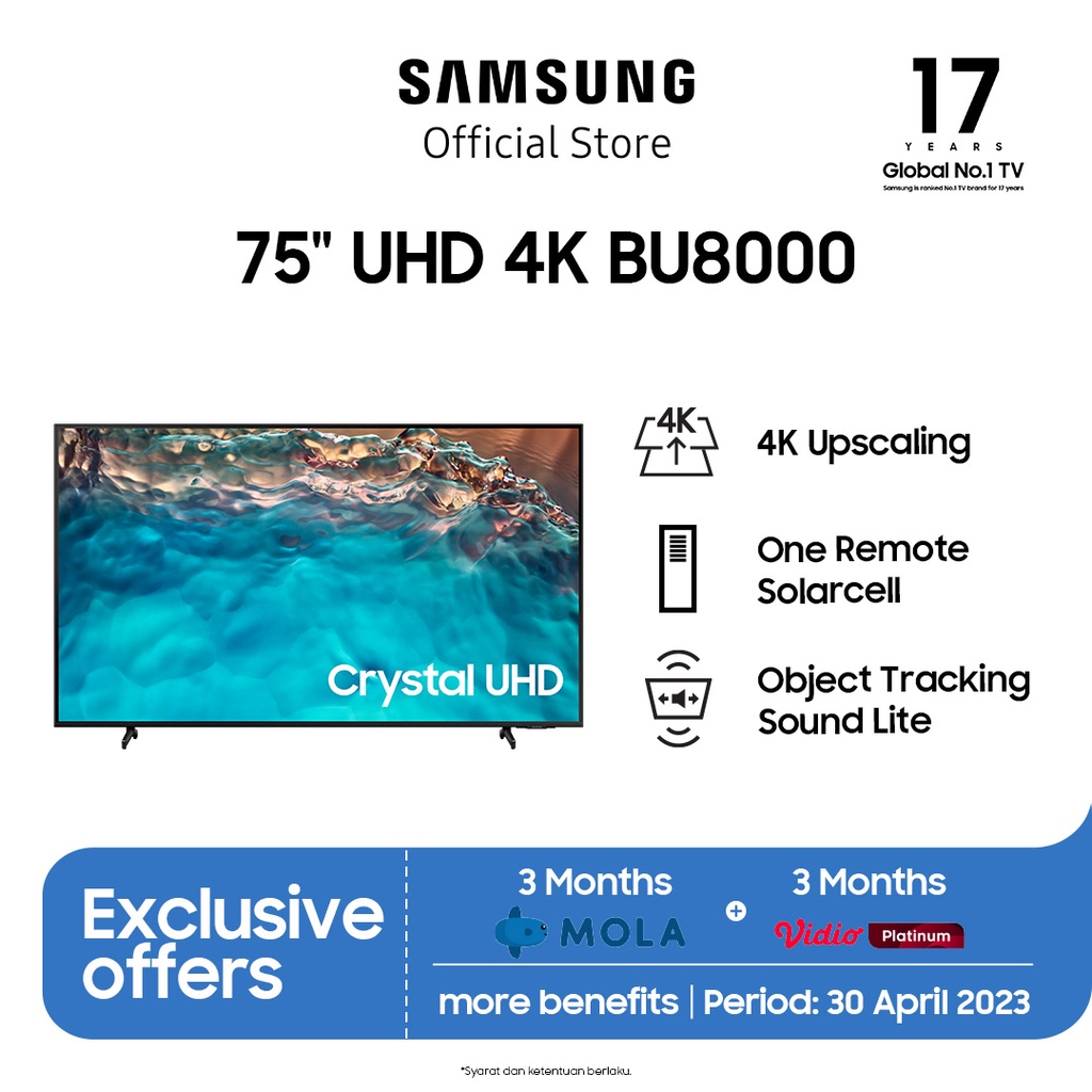 | Promo Period: 01 August – 30 September 2022 – Dynamic Crystal Color Hasilkan kualitas gambar UHD di tingkat yang baru dengan teknologi fosfor warna tercanggih. Berikan beragam warna yang sangat nyata hingga Anda dapat melihat semuanya begitu jelas. – AirSlim Desain tipis TV Anda yang menakjubkan akan menyatu sempurna di dinding, seperti Anda belum pernah lihat sebelumnya. – Rasakan setiap warna yang sangat nyata dengan kualitas 4K *Pengalaman menonton dapat berbeda tergantung jenis dan format konten. *Peningkatan dapat tidak berlaku bagi koneksi PC dan Mode Game. – Smart Hub Smart Hub terbaru dari Samsung menampilkan koleksi terbaik dan pencarian konten di awal serta bagian utama. *Layanan dan rekomendasi konten dapat berbeda tergantung wilayah *Perjanjian Syarat dan Ketentuan dari Smart Hub serta Kebijakan Privasi diperlukan sebelum penggunaan. – Contrast Enhancer Contrast Enhancer menjadikan setiap gambar terlihat lebih natural dan detail luar biasa. – High Dynamic Range (HDR) meningkatkan rentang level pencahayaan di TV Anda supaya Anda dapat menikmati spektrum warna yang besar hingga detail terkecil di gambar, bahkan dalam kondisi paling gelap. – Motion Xcelerator Nikmati gambar jernih dengan performa terbaik dari Motion Xcelerator yang menyesuaikan frame per detik secara otomatis sehingga mengurangi gerakan patah-patah. – Auto Low Latency Mode (ALLM) Rasakan pengalaman bermain paling mulus dengan performa grafis yang mengesankan tiada gerakan yang buram dan vibrasi. *Pengukuran lag terendah berdasarkan kondisi uji coba internal dan hal ini dapat berubah tergantung dengan pengaturan dalam permainan atau sumber perangkat. – Object Tracking Sound Lite (OTS Lite) Suara tiga dimensi yang mengelilingi Anda dengan dukungan saluran audio virtual terbaik akan semakin menghanyutkan Anda dalam suara yang memukau. – Q-Symphony Pengalaman dengarkan harmoni suara TV dan Samsung soundbar yang mengelilingi Anda, dihasilkan dari keunikan Q-Symphony yang menstimulasi speaker TV dan soundbar untuk bekerja secara bersamaan demi menciptakan efek suara apik yang menyelimuti ruangan. *Q-Symphony hanya tersedia di soundbar yang kompatibel. *Periksa kompatibilitas Q-Symphony di spesifikasi produk soundbar. – Adaptive Sound Adaptive Sound memiliki teknologi kecerdasan audio yang begitu komprehensif untuk mengoptimalkan suara berdasarkan analisa aktual dari setiap jenis konten. – SolarCell Remote Saatnya beralih dari baterai sekali pakai ke SolarCell Remote ramah lingkungan yang dilengkapi dengan panel surya di bagian belakang. Mikrofon bawaan juga telah mendukung fitur Voice Assistant. *Untuk pengisian daya remote tenaga surya, posisikan remote TV dengan bagian panel surya menghadap ke atas. Letakkan di ruang tamu Anda saat lampu ruangan menyala atau dapat Anda letakkan di dekat jendela yang terpapar sinar matahari. – Adjustable Stand Atur ketinggian dan jarak dudukan TV sesuai keinginan Anda dan ini juga dudukan TV yang paling tepat menyesuaikan soundbar Anda. – SmartThings SmartThings begitu mudah terhubung, memantau dan kendalikan semua perangkat pintar Anda, bahkan dapat mengendalikan rumah Anda dengan mahir. Cukup gunakan remote atau fitur suara sambil menonton TV. *Teknologi, fungsi, dan fitur yang tersedia dapat berbeda tergantung pada negara, penyedia layanan, lingkungan jaringan, atau produk. Hal itu dapat berubah tanpa pemberitahuan. *Diperlukan Wi-Fi, Bluetooth, atau koneksi jaringan nirkabel lainnya dan perangkat yang terdaftar di aplikasi SmartThings. *Perangkat yang terhubung dijual terpisah. – Video Call Application Begitu mudahnya terhubung dengan orang tercinta di layar besar yang megah dengan Google Duo menggunakan Samsung Slim Fit Cam atau kamera ponsel pintar pribadi untuk lakukan panggilan video tanpa hambatan. *Diperlukan tambahan kamera Samsung Slim Fit yang kompatibel, webcam Logitech yang kompatibel, atau kamera ponsel. *Dijual terpisah. – Multiple Voice Assistants Pilih Voice Assistant favorit Anda – Bixby. Voice Assistant bawaan yang memberikan pengalaman hiburan paling optimal dan kendali tercanggih untuk rumah Anda. *Samsung dapat mengubah/menangguhkan/menghentikan penyediaan sebagian atau semua layanan asisten suara kapan saja atas kebijakannya sendiri tanpa peringatan atau pemberitahuan sebelumnya. *Perintah suara Bixby mengenali bahasa Inggris (US/UK), Prancis, Spanyol, Jerman, Italia, Cina, dan Korea. Tidak semua aksen, dialek, dan ekspresi dikenali. *Google adalah merek dagang dari Google LLC. – Workspace Kemudahan akses ke PC, Laptop, dan ponsel Anda dengan TV *Kompatibel dengan PC dan perangkat seluler tertentu. *Aplikasi Easy Connection tersedia di PC yang menjalankan OS Windows 10. *Samsung DeX didukung oleh perangkat Galaxy, Note, dan Tab tertentu. *Sebagian besar fungsi Workspace dapat digunakan dengan menghubungkan Keyboard dan Mouse ke TV. |