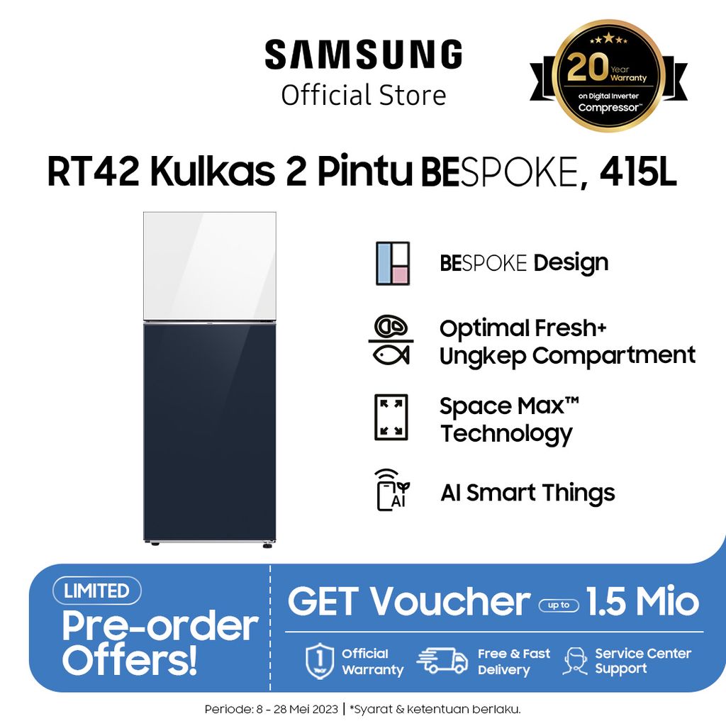 | Samsung Kulkas 2 Pintu dengan Bespoke Design, Compartment dan AI Smart Things, 415L – RT42CB66208ASE |