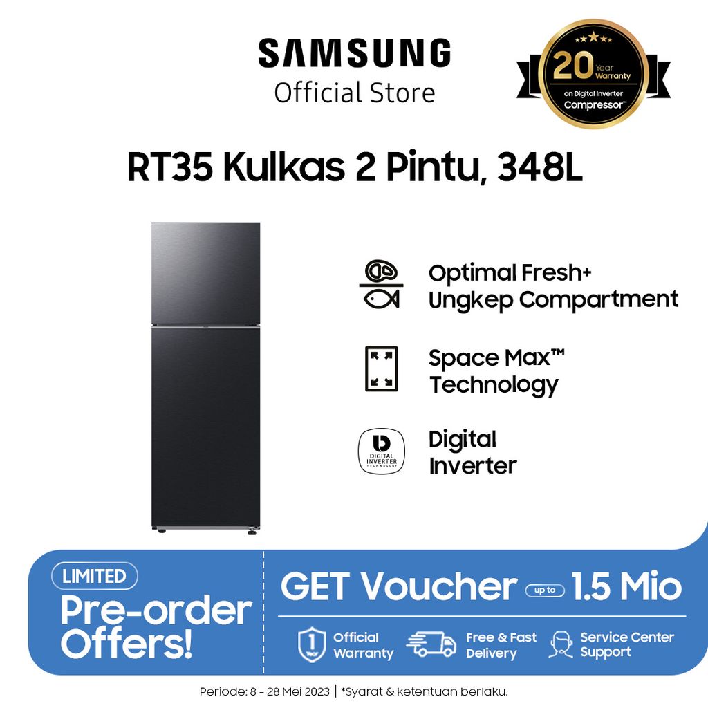 | Samsung Kulkas 2 Pintu dengan Compartment, Spacemax dan Digital Inverter, 348L – RT35CG5420B1SE |