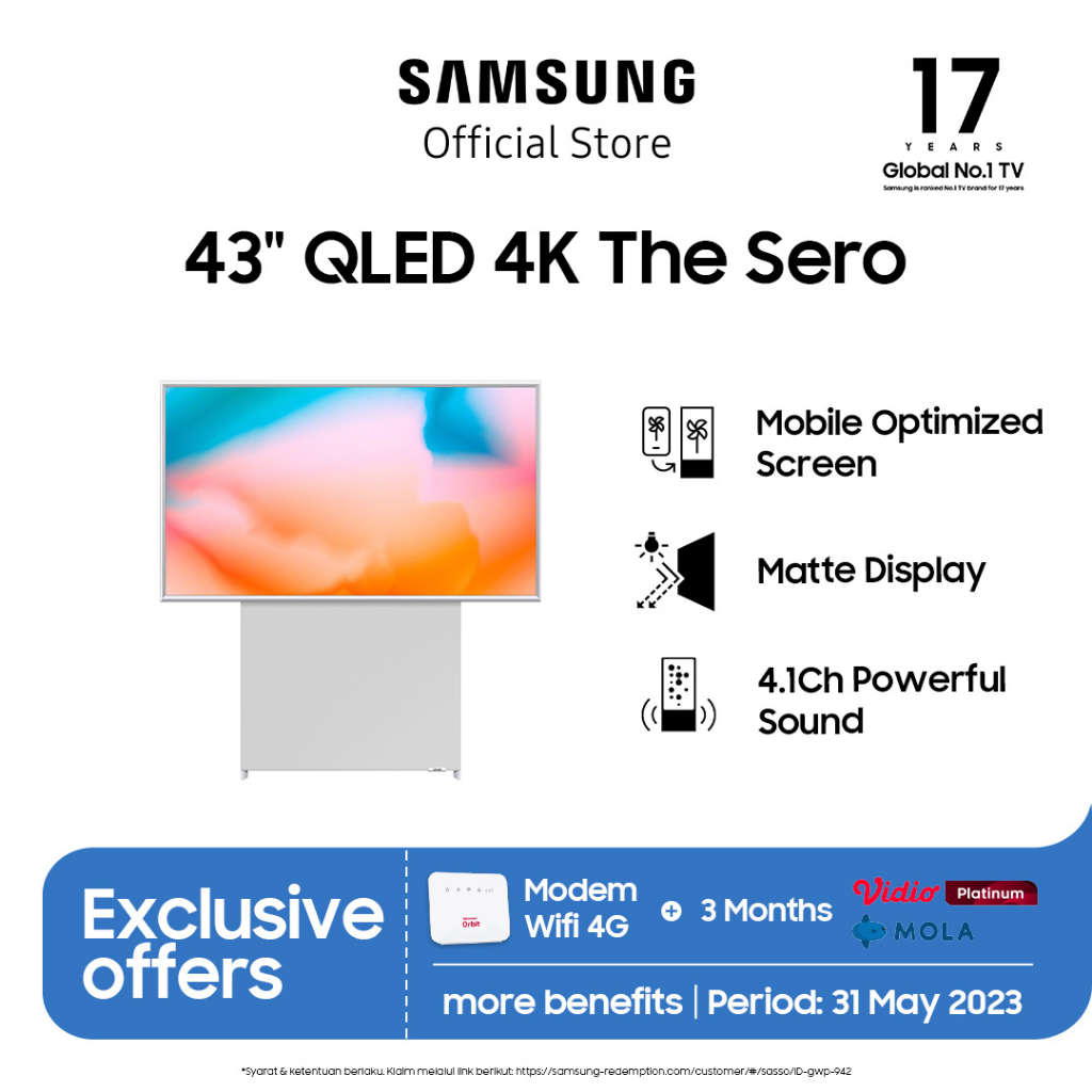 Visit Samsung’s website to redeem your gift with this purchase: https://samsung-redemption.com/customer/#/sasso/ID-gwp-705 Period: 1 Aug – 30 Sept 20224 Fitur Terbaik: 1. Mobile Optimized Screen Semua hiburan yang kamu suka, lebih besar & lebih baik 2. Matte Display Lebih nyaman melihat layar tanpa berbayang 3. 4.1Ch Powerful Sound Suara yang berkualitas premium 4. QLED Technology Lebih hidup dengan miliaran warna Mobile Optimized Screen Nikmati ragam konten seluler Anda lebih besar & lebih baik dengan The Sero, yang bergerak dari mode lanskap ke potret. Matte Display Nikmati ragam konten di layar dengan Matte Display terbaru yang dapat mengurangi rasa silau secara drastis. Premium speaker 4.1ch 60W Speakers Dengarkan beragam lagu favorit dari perangkat seluler ke pengeras suara yang kuat dari The Sero 4.1ch 60-watt untuk pengalaman yang menyeluruh. 100% Color Volume Perkaya pengalaman menonton Anda dengan teknologi QLED. Apapun yang ada di layar Anda, terlihat lebih spektakuler dari kualitas gambar QLED yang mempunyai banyak warna dengan Quantum Dot. Dynamic design, enormous possibility Dengan gaya minimal Navy Blue yang elegan, The Sero adalah tambahan interior bergaya yang hemat tempat. Tersedia dengan warna Space White, The Sero dapat memperkaya suasana dan menyatu dengan sempurna di ruang Anda. Vertical Design Vertical Screen dengan penyangga untuk semua lantai dan Speaker Premium 60W. The Sero Wheel The Sero Wheel membantu Anda untuk memindahkan TV sehingga bisa Anda nikmati di ruangan mana pun rumah Anda. Mobile Mirroring Tampilkan layar ponsel Anda untuk pengalaman visual lebih besar dan lebih baik dari ponsel Anda dengan aplikasi SmartThings untuk Android dan iOS, atau AirPlay untuk perangkat Apple. Tap View Cukup satu ketukan pada bezel untuk menampilkan konten dari smartphone Anda di The Sero. Mobile Entertainment Ucapkan selamat tinggal pada garis hitam yang muncul saat Anda memutar rekaman video dari smartphone Anda di TV. The Sero menampilkan rasio aspek yang lebih optimal sehingga Anda dapat sepenuhnya menikmati konten, aplikasi dan sosial media di layar yang lebih besar. Ambient Mode+ The Sero menyatu sempurna dengan ruangan mana pun. Ubah suasana kamar Anda dengan beragam pilihan Ambient Mode. Al Upscaling Dari data warna dan tekstur, hingga detail pencahayaan dan kontra, The Sero meningkatkan semuanya menjadi kualitas gambar 4K dengan menganalisis setiap adegan konten Anda. Ini juga berfungsi jika kualitas sumber konten Anda bukan 4K. Adaptive Picture Pengalaman luar biasa dari hasil gambar sempurna yang secara otomatis dioptimalkan untuk tingkat kecerahan dan kontras layar. Hal ini tergantung pada kondisi tampilan dan konten yang Anda tonton. Smart Hub_Global (cek gambar yang tepat untuk wilayah Anda) Temukan film, acara TV, game dan tampilan suasana favorit anda dalam satu tempat. SmartThings SmartThings dapat terhubung dengan perangkat pintar Anda untuk membuat hidup lebih pintar. Anda dapat mengontrol perangkat secara langsung dengan remote atau suara. SolarCell Remote Selamat tinggal baterai sekali pakai, langsung beralih ke SolarCell Remote yang bisa mengisi daya dengan sinar matahari dan lampu dalam ruangan. |