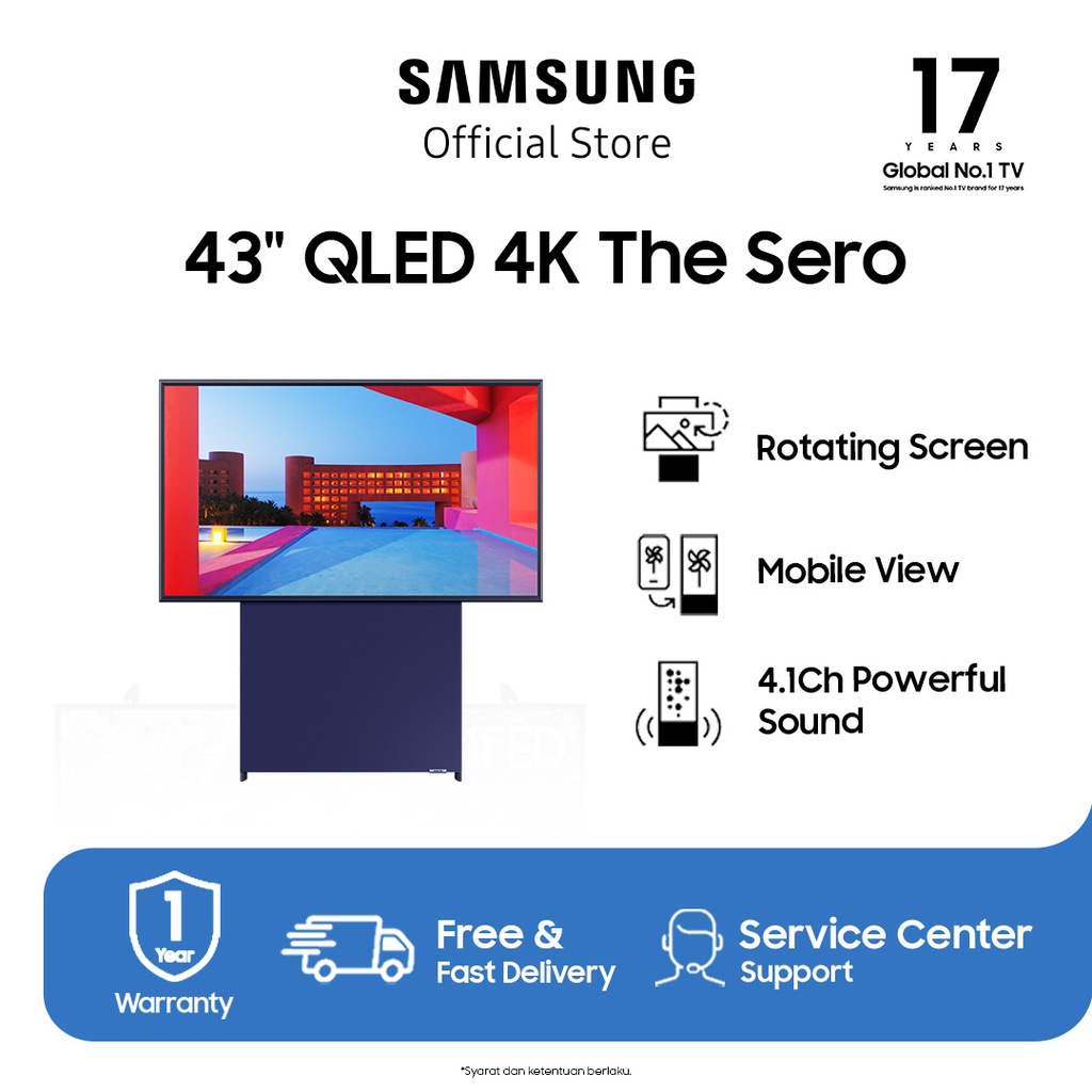 | Deskripsi | Visit Samsung’s website to redeem your gift with this purchase: https://samsung-redemption.com/customer/#/sasso/ID-gwp-715 Period: 1 – 17 August 2022TV that moves to fit your content The Sero’s screen rotates so you can watch your favorite content whether it’s in portrait or landscape. Whether vertical for mobile content and apps or horizontal for movies and TV shows, you’ll always have the best viewing perspective. The most mobile-friendly TV Tap to mirror content Simply tap your phone to your TV to seamlessly start casting content. It’s never been easier to watch mobile content on the big screen. * Tap View is available on Samsung Galaxy devices with Android OS 8.1 and higher. * This service only works when mobile is on. Mobile content just got bigger No more black bars when you play a mobile video on your TV. The Sero displays an optimized aspect ratio so you can enjoy content, apps, and social media on the entire screen. * Feature availability may vary by mobile device. Check before use. Control your home with SmartThings The Sero works with SmartThings to put you in control of your smart home. The Sero links with IoT devices and sensors so you can turn on the lights, check what’s inside your fridge, and even run the robot vacuum cleaner right from the comfort of your couch. * Each device must be connected to Wi-Fi or other wireless network. * Must download and install the SmartThings app. * For interoperability through SmartThings, all the devices should be registered with a single Samsung Account. Works with AirPlay 2 With AirPlay 2, you can stream or share content from Apple devices to the big screen. Effortlessly play videos, music, photos and more from your iPhone, iPad and Mac on your Samsung TV. * AirPlay 2 functionality is available on all 2020 and later Samsung Smart TV. * AirPlay 2 requires iOS 12.3 or later, or macOS 10.14.5 or later for horizontal only mode. * The content within the screen are simulated images and are for demonstration purposes only. * Functionality may be updated for additional compatibility. Portrait Modes The Sero blends seamlessly into your space even when you’re not watching content. Match or redefine any room’s ambience with one of five modes – poster, clock, photo, sound wall, or Cinemagraph. |