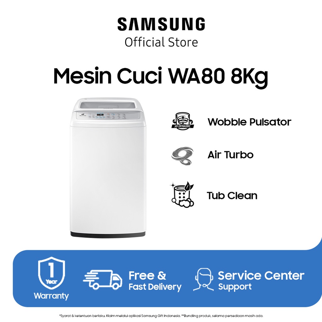 Mesin Cuci Top Loading Kapsitas 8 kg Sistem Pengeringan Turbo Air Teknologi Eco Tub Clean Panel kontrol cluster ganda Warna Putih Garansi 1 Tahun Cara mengatur mode pengeringan otomatis setelah pencucian: Fungsi pengeringan mesin cuci bertujuan untuk mengurangi atau menghilangkan waktu pengeringan dengan memanaskan bagian dalam mesin cuci. Mode pencucian standar akan dipilih secara otomatis, dan mode ini tidak bisa diubah setelah pengoperasian dimulai. Langkah 1. Tekan tombol daya untuk menyalakan mesin cuci. Langkah 2. Pilih mode yang diinginkan dengan memutar tombol putar pemilihan mode. Langkah 3. Tekan tombol tingkat Pengeringan untuk memilih. Langkah 4. Tambahkan detergen dan pelembut sesuai dengan jumlah cucian. Langkah 5. Tekan tombol Start/Pause untuk memulai siklus pencucian dan pengeringan Product Specification Tegangan : 220 kHz Daya Mencuci : 330 W, Daya Pengeringan 240 Watt Tipe Bukaan : Atas Kecepatan Peras : sekitar 700 RPM Pengunci Pintu : Belum Tersedia Inlet Air : Otomatis Inverter : Belum Tersedia Product Size Dimensi : 54 x 85 x 56 cm Berat : Sekitar 36 Kg Product Capacity Kapasitas pencucian : 8 kg Penggunaan Air : ? 160 liter, lv 1 – 5 : 22 L, 29 L, 40 L, 53 L, 60 L Product Feature Mesin Inverter : – Memiliki tenaga yang powerfull sehingga lebih bersih dan higenis, sistem magic dispenser membuat tidak tertinggalnya residual pewangi ataupun detergen pada disepenser sabun, fitur magic filter yang efektif dan mudah dibersihkan, Tersedia fitur Eco Tub Clean untuk membersihkan seisi tabung, lalu masih tersedia fitur Dual Cluster Control, Diamond Drum, dan Woble Pulsator Product Function and Instructions to Use Mode pencucian : Fuzzy (Penccian biasa), Quick (Pencucian cepat, Jeans, Blanket (Untuk seprei ataupun selimut), Soak (Perendaman), dan Delicates (Serta Eco Tub Clean) Package Include 1x Unit, 1x Kelengkapan Dokumen Dapatkan voucher belanja Unilever sebesar 50.000 dengan pembelian produk ini, selama periode 11 – 30 November 2022, untuk 15 pembeli pertama. Syarat & Ketentuan: – Voucher belanja Unilever bersifat “first come-first serve”, dan diperoleh dengan berbelanja produk Samsung Home Appliances pada periode 11 – 30 November 2022 -Untuk pembeli yang berhak mendapatkan voucher Unilever, selanjutnya voucher akan dikirimkan ke akun pembeli dalam waktu 3-4 minggu kedepan setelah periode campaign berakhir – Jumlah voucher belanja Unilever terbatas – Shopee berhak mengubah syarat & ketentuan voucher belanja Unilever tanpa pemberitahuan terlebih dahulu – Penentuan pemenang voucher sepenuhnya ditentukan pihak brand dan tidak bisa diganggu gugat |
