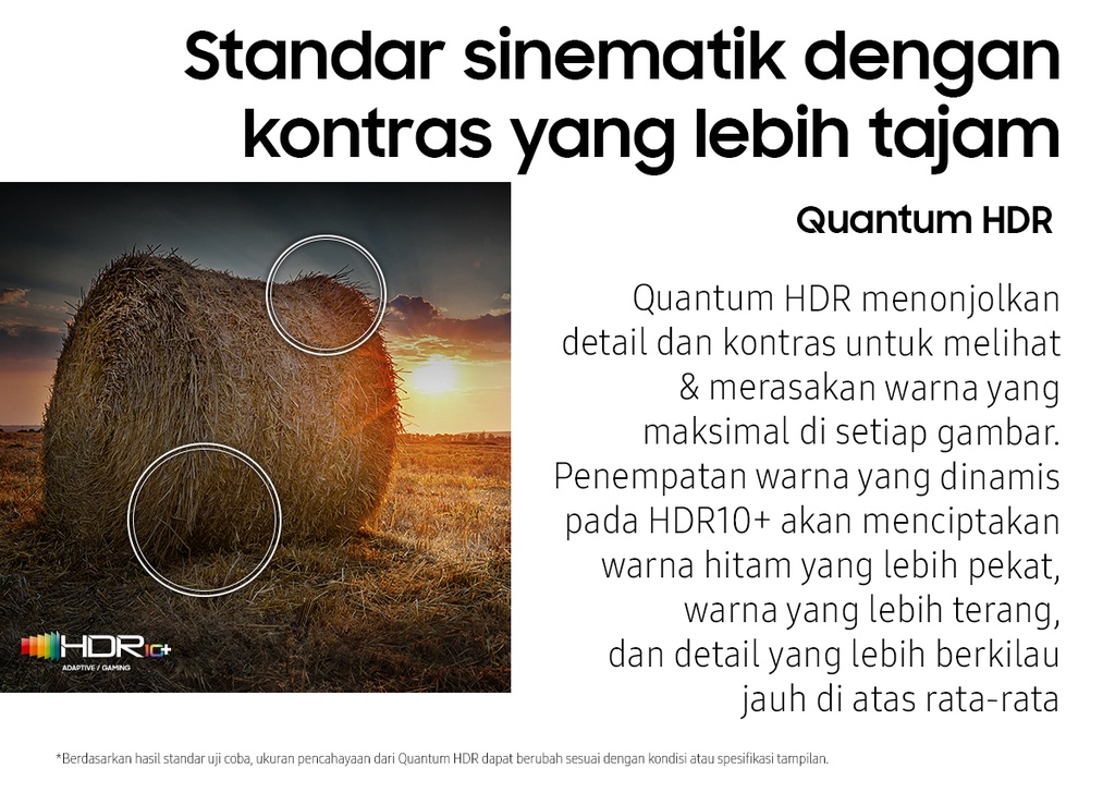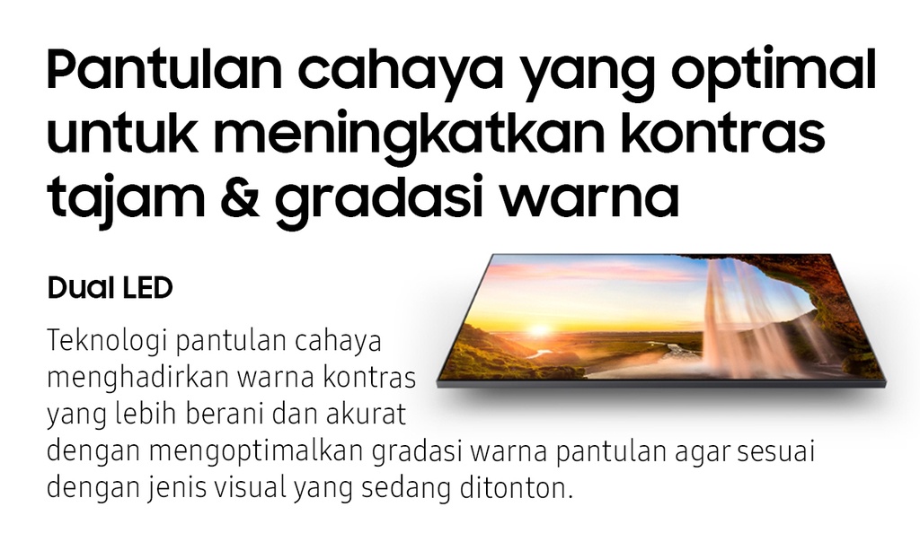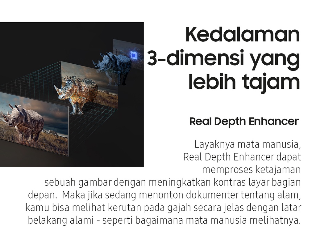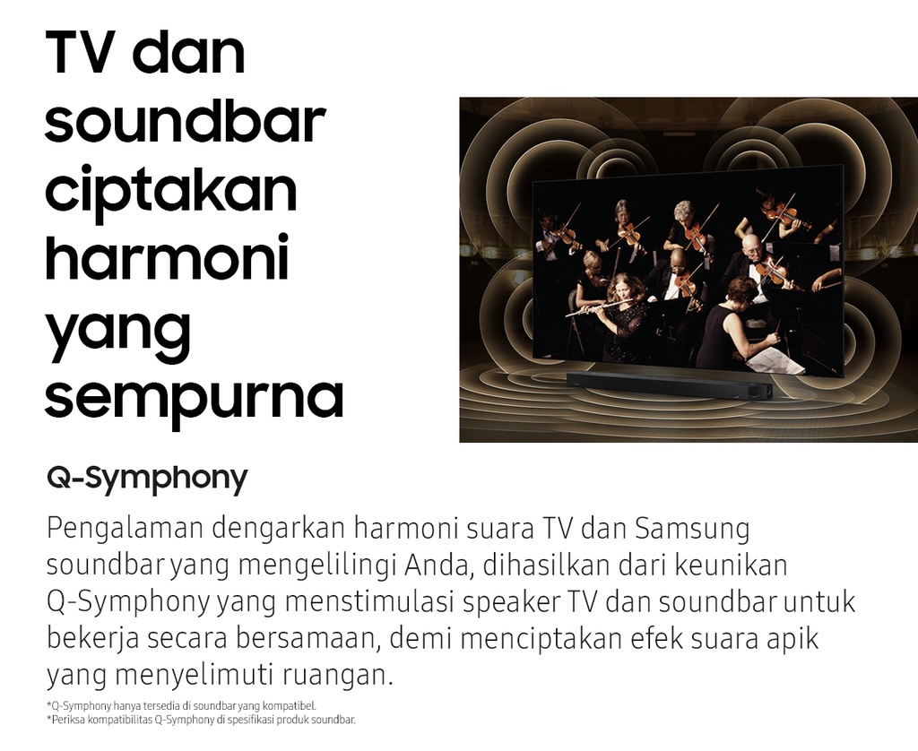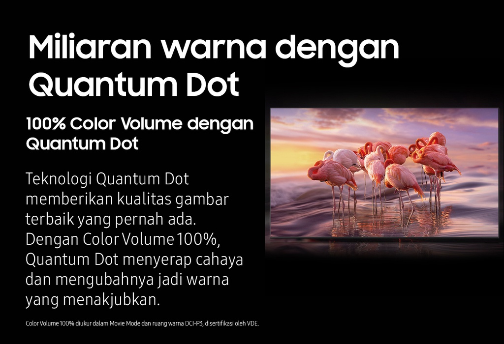 | Deskripsi | Quantum Processor 4KQuantum Processor 4K mendorong kinerja secara menyeluruh untuk mengoptimalkan gambar, suara dan lebih banyak lagi, sehingga dapat memberikan pengalaman menonton yang bener-benar menakjubkan untuk Anda.Motion Xcelerator TurboTaklukkan setiap lawan, bahkan dalam pertandingan adu kecepatan tinggi. Dengan penambahan perangkat untuk peningkatan gerakan yang luar biasa hingga 4K 120Hz, Anda bisa menikmati gameplay dengan aksi yang sangat halus tanpa nge-lag dan gerakan yang anti-blur.FreeSync Premium ProDengan sertifikasi teknologi dasar AMD FreeSync Premium Pro�?, rasakan gambar bebas ngadat dan hasil gambar cacat yang semakin berkurang.Smart HubSmart Hub terbaru dari Samsung menampilkan koleksi terbaik dan pencarian konten di awal serta bagian utama. Agar Anda lebih sedikit menghabiskan waktu saat mencari dan lebih banyak waktu untuk streaming film, acara hiburan dan konten lain yang Anda sukai.Quantum HDRQuantum HDR menonjolkan detail dan kontras untuk melihat & merasakan warna yang maksimal di setiap gambar.Dual LEDDengan teknologi cahaya belakang paling inovatif, hadirkan warna kontras yang lebih berani dan akurat dengan mengoptimalkan gradasi warna cahaya belakang untuk menyesuaikan tipe konten yang sedang ditonton.EyeComfort ModeBersama EyeComfort Mode dari Samsung, Anda dapat mencocokkan kondisi saat matahari sedang terbit atau terbenam di layar Anda, sehingga tampilan layar menyesuaikan secara otomatis.Quantum DotTeknologi Quantum Dot memberikan kualitas gambar terbaik yang pernah ada. Dengan Color Volume 100%, Quantum Dot menyerap cahaya dan mengubahnya jadi warna yang menakjubkan.Real Depth EnhancerLayaknya mata manusia, Real Depth Enhancer dapat memproses ketajaman sebuah gambar dengan meningkatkan kontras layar bagian depan. Maka jika sedang menonton dokumenter tentang alam, Anda bisa melihat kerutan pada gajah secara jelas dengan latar belakang alami – seperti bagaimana mata manusia melihatnya.Q-SymphonyPengalaman dengarkan harmoni suara TV dan Samsung soundbar yang mengelilingi Anda, dihasilkan dari keunikan Q-Symphony yang menstimulasi speaker TV dan soundbar untuk bekerja secara bersamaan, demi menciptakan efek suara apik yang menyelimuti ruangan.SpaceFit SoundNikmati suara yang dioptimalkan menyesuaikan suasana ruang dan instalasi, baik di dinding atau di atas meja, akan tetap memberikan pengalaman suara yang optimal dan maksimal.AirSlimDesain tipis TV Anda yang menakjubkan akan menyatu sempurna di dinding, seperti Anda belum pernah lihat sebelumnya.SmartThingsSmartThings begitu mudah terhubung, memantau dan kendalikan semua perangkat pintar Anda, bahkan dapat mengendalikan rumah Anda dengan mahir.Video Call ApplicationBegitu mudahnya terhubung dengan orang tercinta di layar besar yang megah dengan Google Duo menggunakan Samsung Slim Fit Cam atau kamera ponsel pintar pribadi untuk lakukan panggilan video tanpa hambatan.Multi viewTonton yang ada di TV dan HP Anda dalam satu layar secara bersamaan.Multiple Voice AssistantsVoice Assistant bawaan yang memberikan pengalaman hiburan paling optimal dan kendali tercanggih untuk rumah Anda.WorkspaceKemudahan akses ke PC, Laptop, dan ponsel Anda dengan TV             |