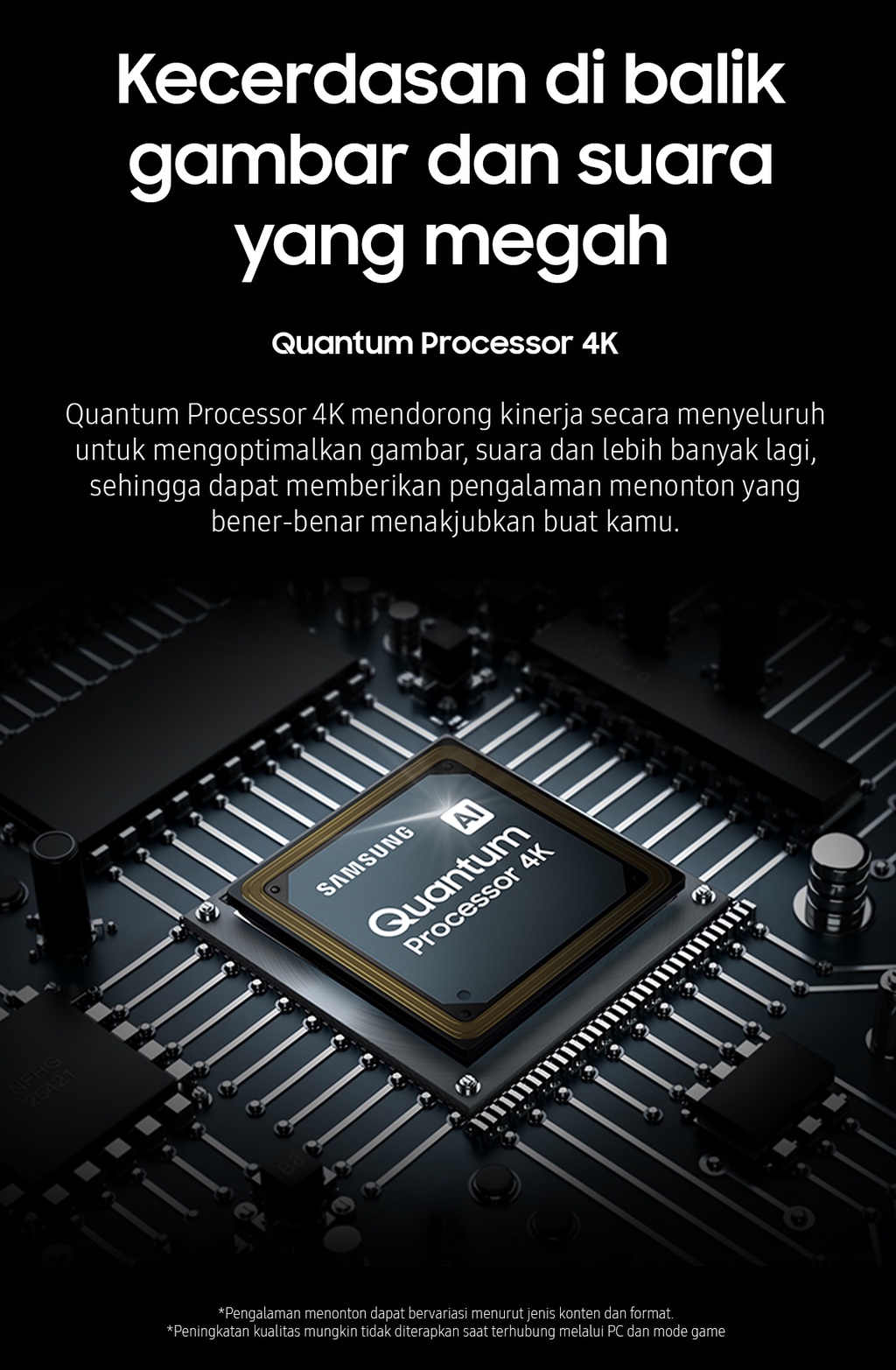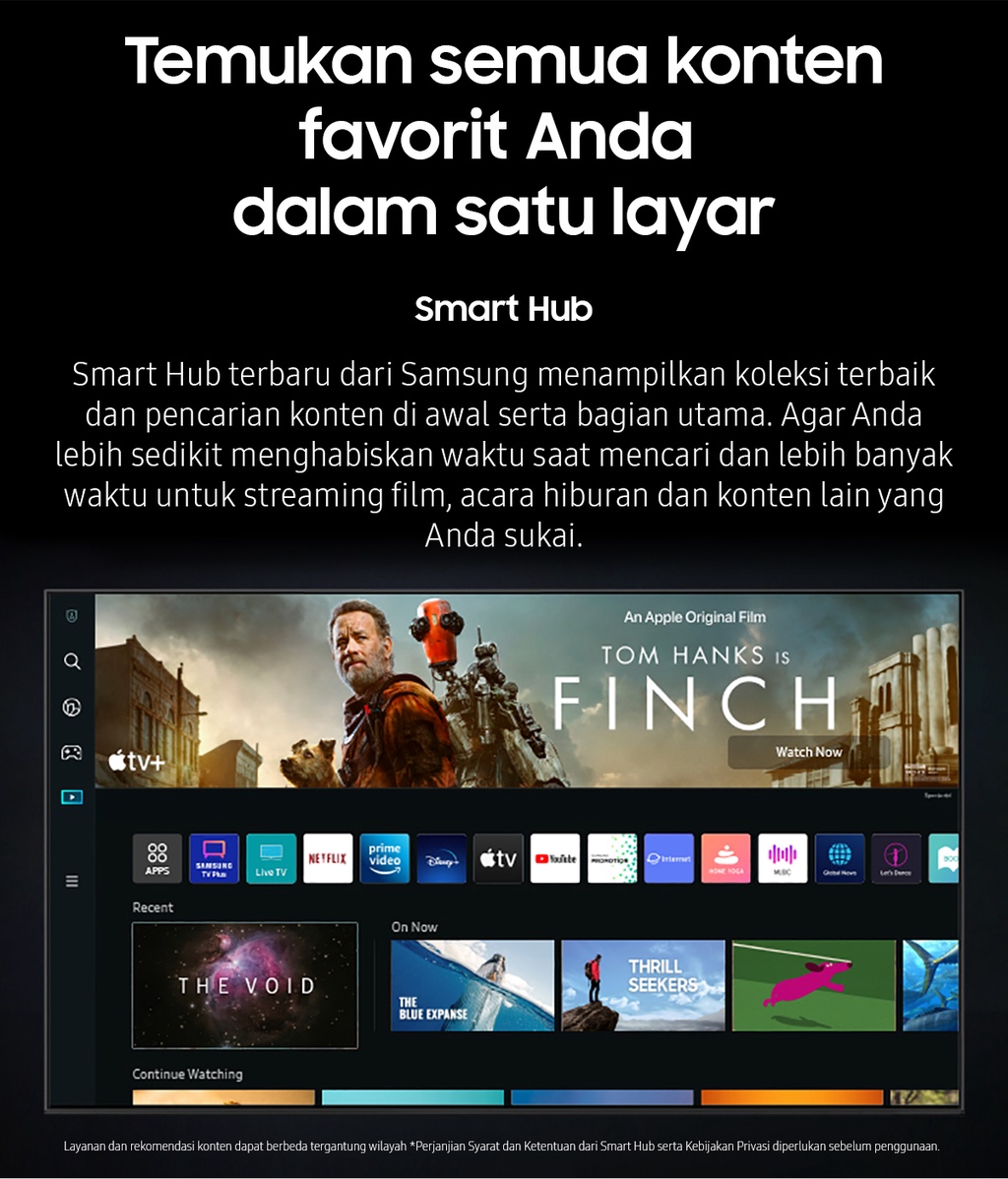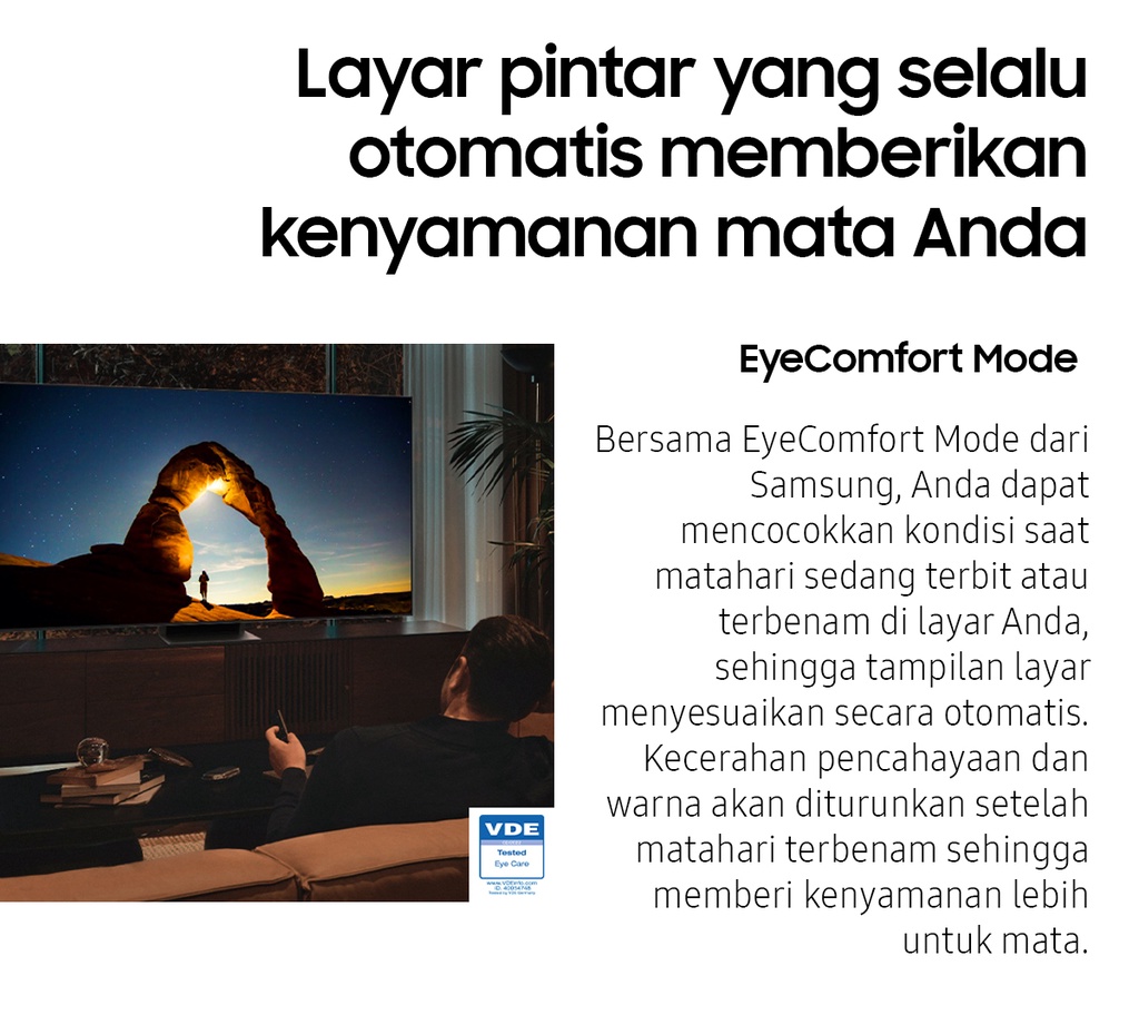 | Deskripsi | Quantum Processor 4KQuantum Processor 4K mendorong kinerja secara menyeluruh untuk mengoptimalkan gambar, suara dan lebih banyak lagi, sehingga dapat memberikan pengalaman menonton yang bener-benar menakjubkan untuk Anda.Motion Xcelerator TurboTaklukkan setiap lawan, bahkan dalam pertandingan adu kecepatan tinggi. Dengan penambahan perangkat untuk peningkatan gerakan yang luar biasa hingga 4K 120Hz, Anda bisa menikmati gameplay dengan aksi yang sangat halus tanpa nge-lag dan gerakan yang anti-blur.FreeSync Premium ProDengan sertifikasi teknologi dasar AMD FreeSync Premium Pro�?, rasakan gambar bebas ngadat dan hasil gambar cacat yang semakin berkurang.Smart HubSmart Hub terbaru dari Samsung menampilkan koleksi terbaik dan pencarian konten di awal serta bagian utama. Agar Anda lebih sedikit menghabiskan waktu saat mencari dan lebih banyak waktu untuk streaming film, acara hiburan dan konten lain yang Anda sukai.Quantum HDRQuantum HDR menonjolkan detail dan kontras untuk melihat & merasakan warna yang maksimal di setiap gambar.Dual LEDDengan teknologi cahaya belakang paling inovatif, hadirkan warna kontras yang lebih berani dan akurat dengan mengoptimalkan gradasi warna cahaya belakang untuk menyesuaikan tipe konten yang sedang ditonton.EyeComfort ModeBersama EyeComfort Mode dari Samsung, Anda dapat mencocokkan kondisi saat matahari sedang terbit atau terbenam di layar Anda, sehingga tampilan layar menyesuaikan secara otomatis.Quantum DotTeknologi Quantum Dot memberikan kualitas gambar terbaik yang pernah ada. Dengan Color Volume 100%, Quantum Dot menyerap cahaya dan mengubahnya jadi warna yang menakjubkan.Real Depth EnhancerLayaknya mata manusia, Real Depth Enhancer dapat memproses ketajaman sebuah gambar dengan meningkatkan kontras layar bagian depan. Maka jika sedang menonton dokumenter tentang alam, Anda bisa melihat kerutan pada gajah secara jelas dengan latar belakang alami – seperti bagaimana mata manusia melihatnya.Q-SymphonyPengalaman dengarkan harmoni suara TV dan Samsung soundbar yang mengelilingi Anda, dihasilkan dari keunikan Q-Symphony yang menstimulasi speaker TV dan soundbar untuk bekerja secara bersamaan, demi menciptakan efek suara apik yang menyelimuti ruangan.SpaceFit SoundNikmati suara yang dioptimalkan menyesuaikan suasana ruang dan instalasi, baik di dinding atau di atas meja, akan tetap memberikan pengalaman suara yang optimal dan maksimal.AirSlimDesain tipis TV Anda yang menakjubkan akan menyatu sempurna di dinding, seperti Anda belum pernah lihat sebelumnya.SmartThingsSmartThings begitu mudah terhubung, memantau dan kendalikan semua perangkat pintar Anda, bahkan dapat mengendalikan rumah Anda dengan mahir.Video Call ApplicationBegitu mudahnya terhubung dengan orang tercinta di layar besar yang megah dengan Google Duo menggunakan Samsung Slim Fit Cam atau kamera ponsel pintar pribadi untuk lakukan panggilan video tanpa hambatan.Multi viewTonton yang ada di TV dan HP Anda dalam satu layar secara bersamaan.Multiple Voice AssistantsVoice Assistant bawaan yang memberikan pengalaman hiburan paling optimal dan kendali tercanggih untuk rumah Anda.WorkspaceKemudahan akses ke PC, Laptop, dan ponsel Anda dengan TV             |