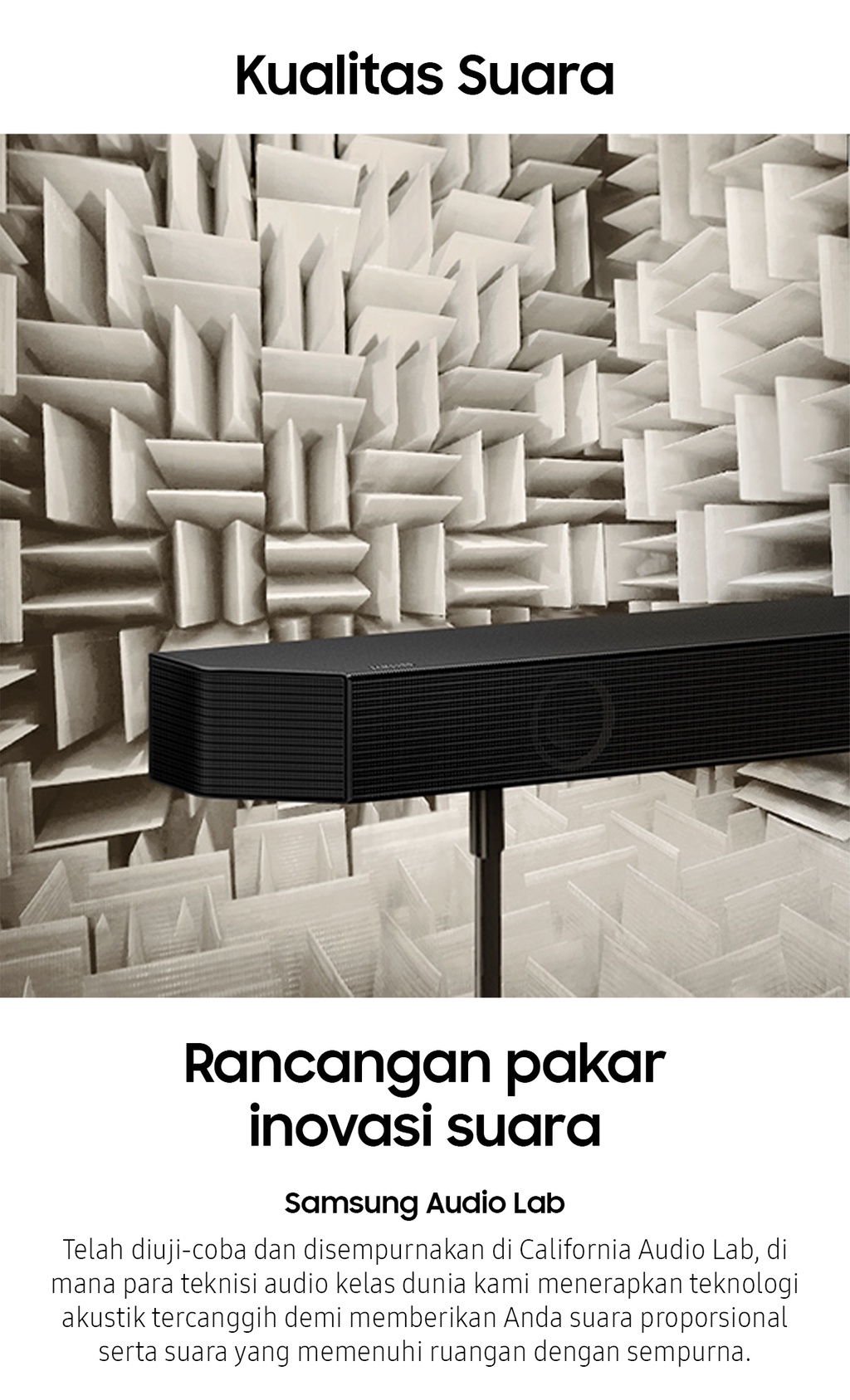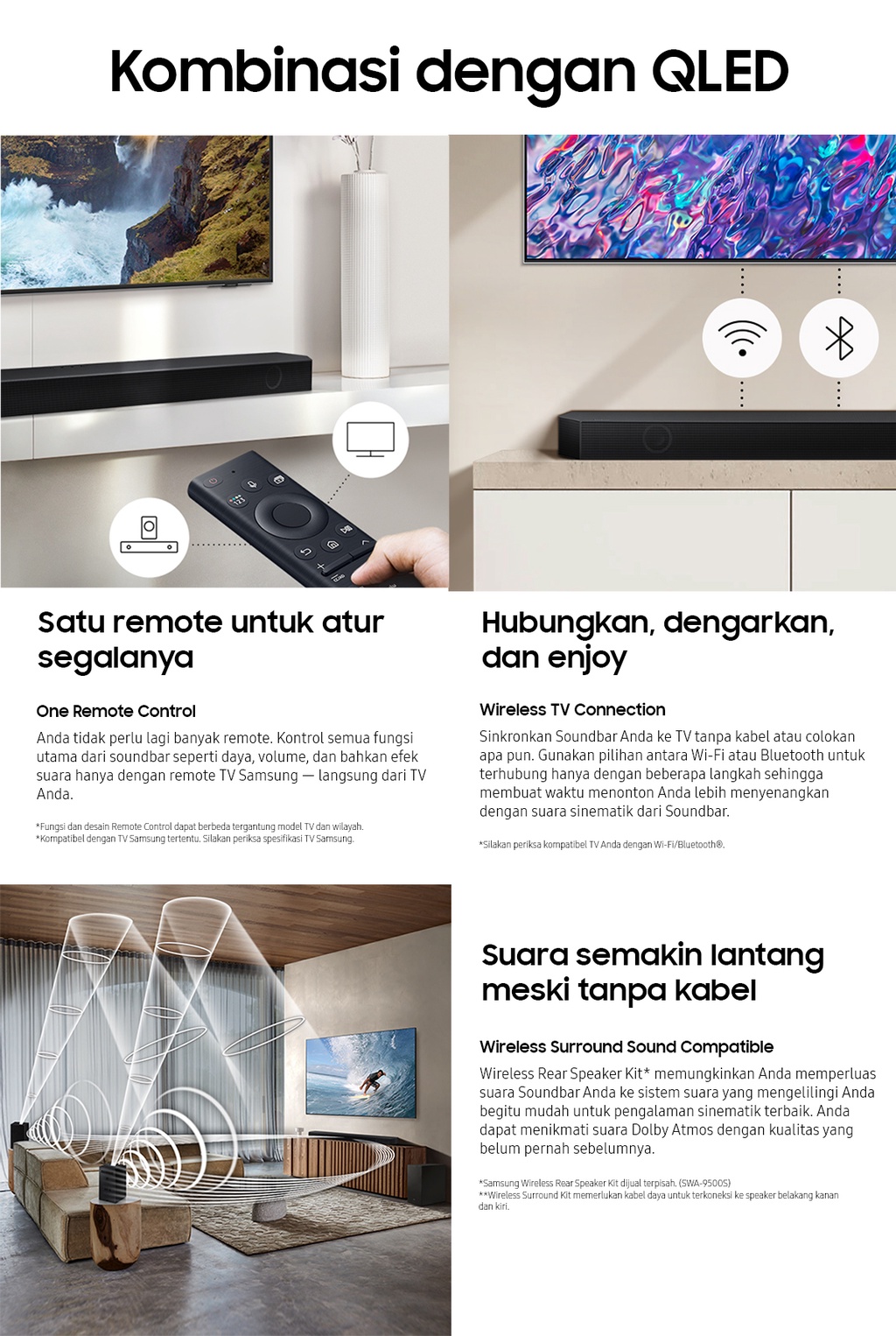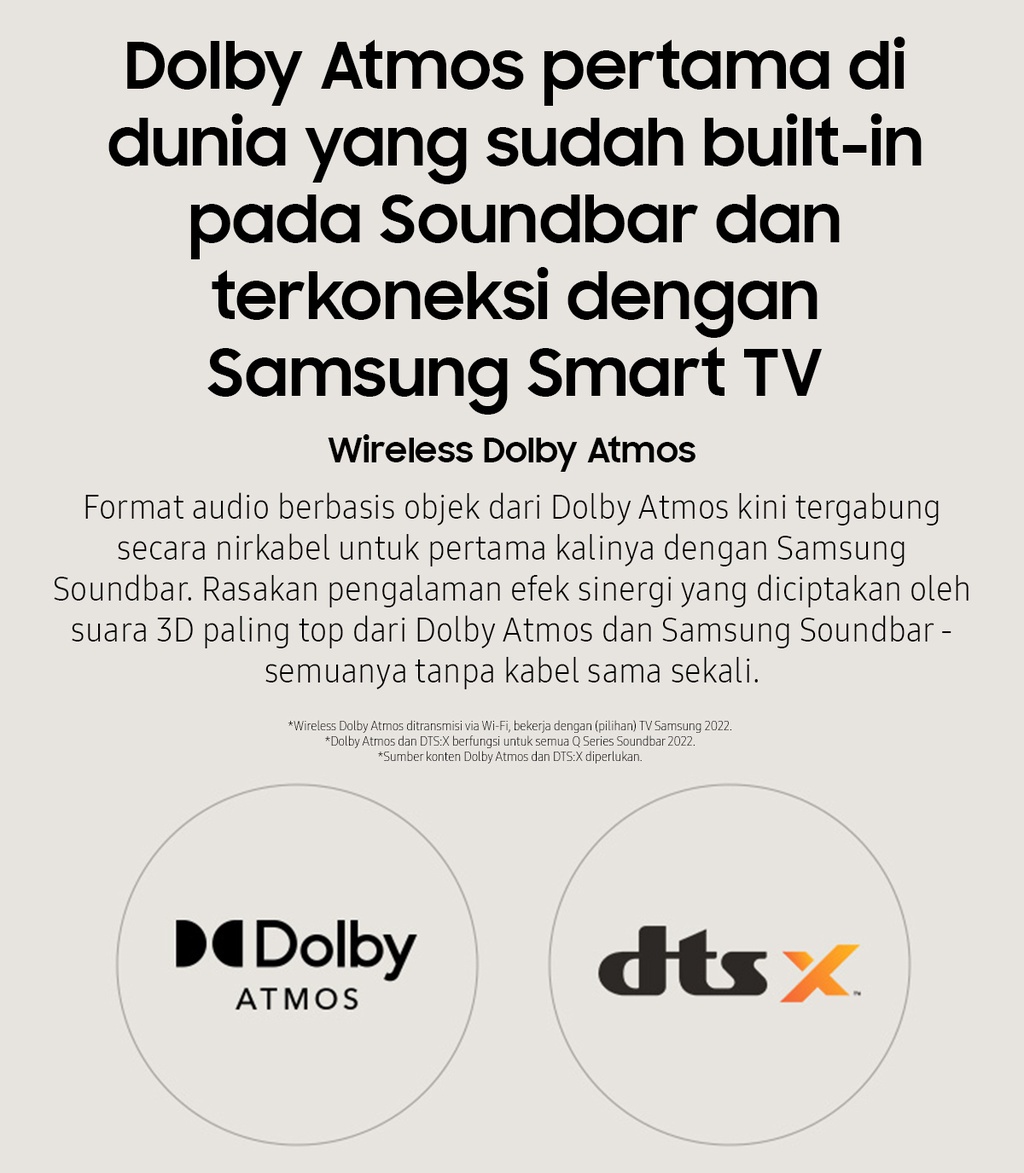| Deskripsi |        4 Fitur Unggulan 1. Wireless Dolby Atmos Dolby Atmos nirkabel pertama di dunia bersama dengan TV Samsung 2. True 3.1.2ch Sound Suara terasa lebih memukau dari atas dengan speaker yang menggelegar 3. Q-Symphony TV dan Soundbar tertata dalam harmoni yang sempurna 4. SpaceFit Sound Suara dikalibrasi untuk ruangan Anda dengan sempurna Wireless Dolby Atmos Format audio berbasis objek dari Dolby Atmos kini tergabung secara nirkabel untuk pertama kalinya dengan Samsung Soundbar. Rasakan pengalaman efek sinergi yang diciptakan oleh suara 3D paling top dari Dolby Atmos dan Samsung Soundbar – semuanya tanpa kabel sama sekali. True 3.1.2ch Sound Dengan 2 speaker yang menggelegar dan Samsung Acoustic Beam Technology, Anda akan mendengar suara mengelilingi Anda begitu menghanyutkan untuk merasakan hiburan sangat memukau. Sangat cocok dengan TV QLED Anda, dengan cakupan audio yang lengkap berkat True 3.1.2nch Sound via Samsung Acoustic Beam. SpaceFit Sound Kombinasi yang tanpa batas dan tanpa gangguan antara Samsung TV dan Samsung Soundbar. Suara yang disempurnakan untuk kejernihan dan menghanyutkan dari Soundbar berdasarkan analisa yang diproses oleh TV Samsung Anda. Q-Symphony Saat Soundbar sinkron dengan TV Samsung Anda, secara bersamaan menciptakan suara yang terdengar sangat nyata. Ini terjadi atas penggabungan dan peningkatan suara melalui speaker Soundbar sisi depan dan samping yang menggelegar begitu juga speaker TV. Samsung Audio Lab Telah diuji-coba dan disempurnakan di California Audio Lab, di mana para teknisi audio kelas dunia kami menerapkan teknologi akustik tercanggih demi memberikan Anda suara proporsional serta suara yang memenuhi ruangan dengan sempurna. Voice Assistant & Cast Services Kontrol Soundbar dengan suara Anda menggunakan perangkat yang menyediakan Google Assistant. Atau mainkan musik langsung dari ponsel Anda. Ketuk Airplay di layar perangkat Apple Anda, atau tombol Cast dari aplikasi yang menyediakan Chromecast. Tap Sound Saat mendengarkan musik favorit Anda di smartphone, cukup Tap di Soundbar dan akan mengenali perangkat serta langsung terhubung untuk memutarkan lagu yang sedang Anda dengar. Adaptive sound Adaptive Sound memungkinkan Anda mendengar suara begitu jelas bahkan di volume rendah sehingga percakapan yang tenang pun tetap terdengar. Game Mode Pro Soundbar secara otomatis beralih ke Game Mode saat Anda mengalihkan TV ke Game Mode untuk membantu Anda fokus bermain, bukan mengurus pengaturan. HDMI eARC HDMI eARC menghasilkan kualitas tanpa kehilangan format suara 3D di sekeliling, seperti Dolby ATMOS, dari konsol game dan pemutar UBD yang terhubung melalui TV ke Soundbar Anda. One Remote Control Anda tidak perlu lagi banyak remote. Kontrol semua fungsi utama dari soundbar seperti daya, volume, dan bahkan efek suara hanya dengan remote TV Samsung � langsung dari TV Anda. Wireless TV Connection Gunakan pilihan antara Wi-Fi atau Bluetooth untuk terhubung hanya dengan beberapa langkah sehingga membuat waktu menonton Anda lebih menyenangkan dengan suara sinematik dari Soundbar. Wireless Surround Sound Compatible Wireless Rear Speaker Kit* memungkinkan Anda memperluas suara Soundbar Anda ke sistem suara yang mengelilingi Anda begitu mudah untuk pengalaman sinematik terbaik. |