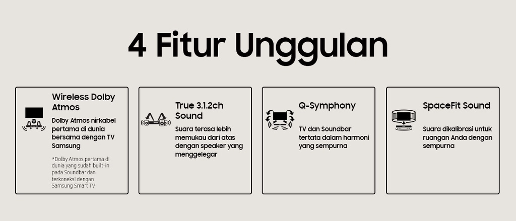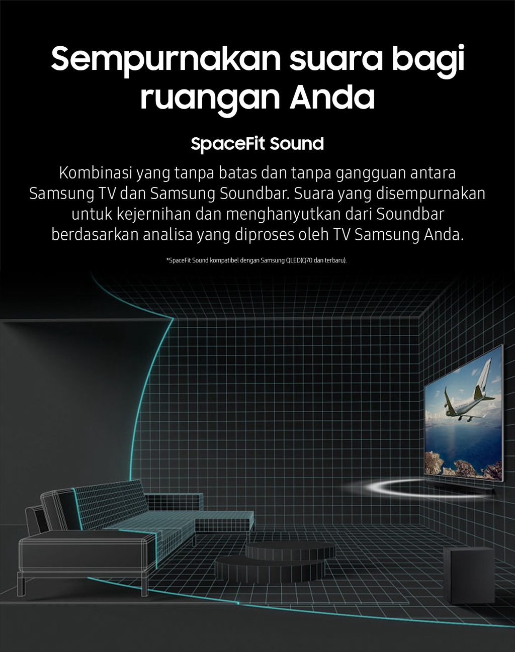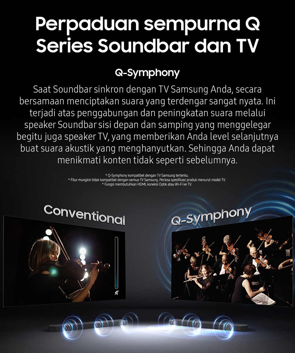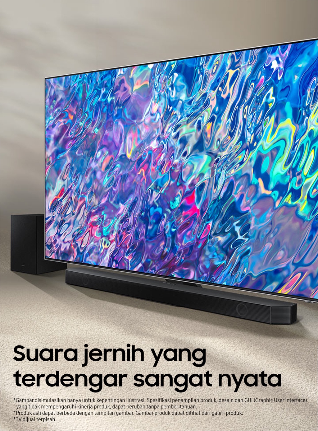 | Deskripsi |        4 Fitur Unggulan 1. Wireless Dolby Atmos Dolby Atmos nirkabel pertama di dunia bersama dengan TV Samsung 2. True 3.1.2ch Sound Suara terasa lebih memukau dari atas dengan speaker yang menggelegar 3. Q-Symphony TV dan Soundbar tertata dalam harmoni yang sempurna 4. SpaceFit Sound Suara dikalibrasi untuk ruangan Anda dengan sempurna Wireless Dolby Atmos Format audio berbasis objek dari Dolby Atmos kini tergabung secara nirkabel untuk pertama kalinya dengan Samsung Soundbar. Rasakan pengalaman efek sinergi yang diciptakan oleh suara 3D paling top dari Dolby Atmos dan Samsung Soundbar – semuanya tanpa kabel sama sekali. True 3.1.2ch Sound Dengan 2 speaker yang menggelegar dan Samsung Acoustic Beam Technology, Anda akan mendengar suara mengelilingi Anda begitu menghanyutkan untuk merasakan hiburan sangat memukau. Sangat cocok dengan TV QLED Anda, dengan cakupan audio yang lengkap berkat True 3.1.2nch Sound via Samsung Acoustic Beam. SpaceFit Sound Kombinasi yang tanpa batas dan tanpa gangguan antara Samsung TV dan Samsung Soundbar. Suara yang disempurnakan untuk kejernihan dan menghanyutkan dari Soundbar berdasarkan analisa yang diproses oleh TV Samsung Anda. Q-Symphony Saat Soundbar sinkron dengan TV Samsung Anda, secara bersamaan menciptakan suara yang terdengar sangat nyata. Ini terjadi atas penggabungan dan peningkatan suara melalui speaker Soundbar sisi depan dan samping yang menggelegar begitu juga speaker TV. Samsung Audio Lab Telah diuji-coba dan disempurnakan di California Audio Lab, di mana para teknisi audio kelas dunia kami menerapkan teknologi akustik tercanggih demi memberikan Anda suara proporsional serta suara yang memenuhi ruangan dengan sempurna. Voice Assistant & Cast Services Kontrol Soundbar dengan suara Anda menggunakan perangkat yang menyediakan Google Assistant. Atau mainkan musik langsung dari ponsel Anda. Ketuk Airplay di layar perangkat Apple Anda, atau tombol Cast dari aplikasi yang menyediakan Chromecast. Tap Sound Saat mendengarkan musik favorit Anda di smartphone, cukup Tap di Soundbar dan akan mengenali perangkat serta langsung terhubung untuk memutarkan lagu yang sedang Anda dengar. Adaptive sound Adaptive Sound memungkinkan Anda mendengar suara begitu jelas bahkan di volume rendah sehingga percakapan yang tenang pun tetap terdengar. Game Mode Pro Soundbar secara otomatis beralih ke Game Mode saat Anda mengalihkan TV ke Game Mode untuk membantu Anda fokus bermain, bukan mengurus pengaturan. HDMI eARC HDMI eARC menghasilkan kualitas tanpa kehilangan format suara 3D di sekeliling, seperti Dolby ATMOS, dari konsol game dan pemutar UBD yang terhubung melalui TV ke Soundbar Anda. One Remote Control Anda tidak perlu lagi banyak remote. Kontrol semua fungsi utama dari soundbar seperti daya, volume, dan bahkan efek suara hanya dengan remote TV Samsung � langsung dari TV Anda. Wireless TV Connection Gunakan pilihan antara Wi-Fi atau Bluetooth untuk terhubung hanya dengan beberapa langkah sehingga membuat waktu menonton Anda lebih menyenangkan dengan suara sinematik dari Soundbar. Wireless Surround Sound Compatible Wireless Rear Speaker Kit* memungkinkan Anda memperluas suara Soundbar Anda ke sistem suara yang mengelilingi Anda begitu mudah untuk pengalaman sinematik terbaik. |