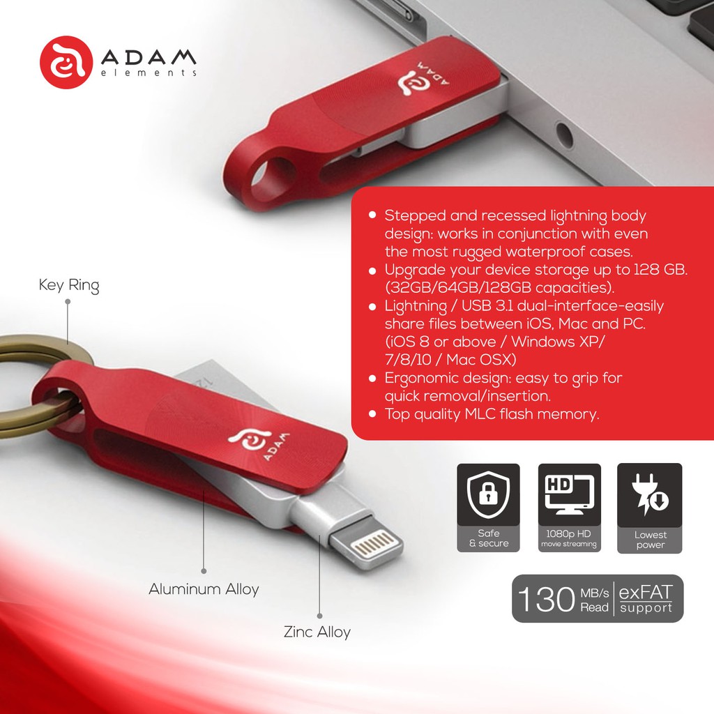 | Deskripsi | Specifications ADAM ELEMENTS IKLIPS DUO+ FLASH DRIVE LIGHTNING 128GB Flash Drive Lightning / USB 3.1 dirancang khusus untuk iPhone, iPod, iPad dan mendukung untuk perangkat iOS, PC & Mac. Mudah berbagi/backup file, foto dan memutar musik/video kapanpun dan dimanapun. Selain itu, Kapasitas penyimpanan dapat langsung diperluas hingga 128GB. – iKlips DUO+ : Lightning / USB 3.1 Gen1 dual-interface – Apple MFi-certified (made for iPhone/iPad/iPod). – Lightning / USB 3.1 Gen1 dual-interface – easily share files between iOS, Mac and PC. (iOS 8 or above / Windows XP/7/8/10 / Mac OSX) – View photos, documents, playback music, TV series and movies, backup and manage files directly from iKlips DUO+ – Upgrade your device storage up to 128 GB (32GB/64GB/128GB capacities). – Read speed: up to 130 MB/s. Support exFAT format, which allows you to transfer the single file sized more than 4GB!! – Safe & Secure since no Internet access, your data is never sent through 3rd party servers. – The lowest power consumption, saves power of your iPhone/iPad. – Stepped and recessed lightning body design: works in conjunction with even the most rugged waterproof cases. – Easy to handle: hassle-free single-handed swivel action. – Ergonomic design: easy to grip for quick removal/insertion. – Leather sleeve: fashionable cover that stores and protects. – Industrial Design: Zinc alloy and aluminum alloy made COB (Chip On Board) which minimizes size and weight while maximizing strength. – Free universal iOS app for iPhone/iPad/iPod touch. – 1080p HD movie streaming, direct playback from iKlips DUO+. – No built-in battery – no need to charge iKlips DUO+. |