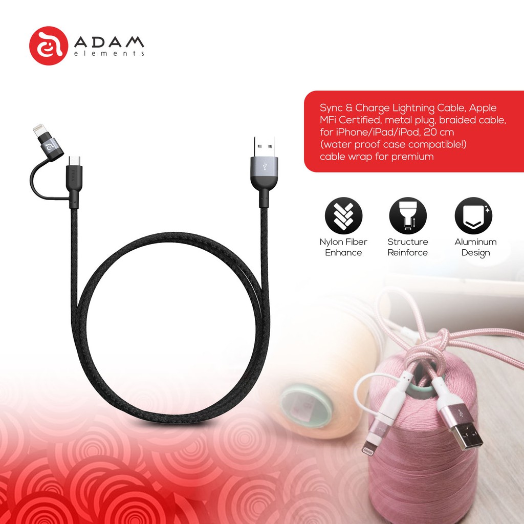 | Deskripsi | Specifications PeAk II Duo 120B Lightning Cable ・ Sync & Charge Lightning Cable, Apple MFi Certified. ・ Premium tangle-free PeAk II cables will fit seamlessly with all of your USB Type-A needs. ・ PeAk ll Lightning cables work while iPad & iPhone cases are on, and that includes waterproof cases too. ・ The last adapter you’ll ever need to buy is PeAk ll Duo as it has both Lightning and Micro USB. ・ ADAM elements cables are the only 3rd party adapters that can do it. Convenience level: maximum. ・ ADAM elements cables surpass average ones by using precision-cut aluminum connector shells and thicker cables for better wear. Seriously tough. ・ Length: 47.2 inches. (120 cm)Compatibility : Andriod Phone, iPhone 7, iPhone 7 Plus, iPhone SE, iPhone 6S Plus, iPhone 6S, iPhone 6 Plus, iPhone 6, iPhone 5S, iPhone 5C, iPhone 5, iPad Pro, iPad mini 4, iPad Air 2, iPad mini 3, iPad Air, iPad mini 2, iPad mini, iPad (4th generation), iPod touch (6th generation), iPod touch (5th generation), Magic Keyboard, Magic Mouse 2, Magic Trackpad2, Siri Remote, and other devices compatible with lightning connector |