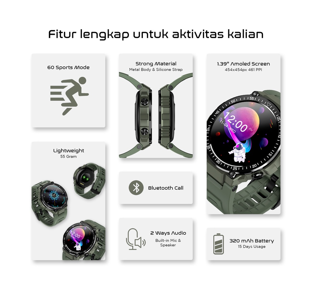 | Advan StartGo Army Force Smartwatch 1.39″ AMOLED | Bluetooth Call | 60 Sports |