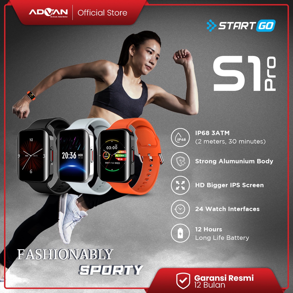 | Deskripsi | Specifications Advan StartGo S1 Pro Smartwatch 1.69” IPS Screen | 15 Sports Modes | SpO2 | IP68 waterproofFitur S1 PRO yang tersedia :+ GPS Path Tracking (By APP in Smartphone)+ Blood pressure+ Blood Oxygen+ Heart Rate Monitor+ IPS Screen 1.69’’ 240*280+ IP68 waterproof+ Call & Message Notification+ 15 Sport Modes+ Battery 200mahSpesifikasi :– Layar 1.69’’ 240*280, Full touch– Resolusi 240*280px– Dimension Watch length: 43.5* Width: 36.6* Thickness: 9.4mm– Bahan : Metal Body + Silicone Strap– Waterproof IP68 (3ATM)– Baterai 200 mAh– Li-Po Rechargeable Battery– Charging Time : 2-4 Jam– Bluetooth 5.0– IOS 9.0+, Android 5.0+ ( BISA semua smartphone )– Normal Usage time : 10-20 Hari– Sensor: G-Sensor, blood pressure, Heart rate,Blood Oxygen,Sleep Monitor, Pedometer– Fitur: IP68 WaterproofKetahanan terhadap air hingga kedalaman 1.5-2 meter selama 30 menit dan aman untuk digunakan berbagaikan aktivitas sehari-hari maupun olahraga.– 15 Mode Olahraga : Indoor running, outdoor running,outdoor cycling, walking, free training, Elliptical machine, mountaineering, rope skipping, weightlifting, Yoga, basketball, football, tennis, badminton, table tennisGARANSI RESMI : 12 BULAN |
