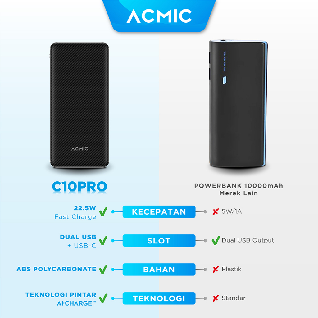 | Deskripsi | Specifications Satu-satunya PowerBank, Adaptor Charger & Kabel Data berteknologi pintar ⚡ ™ yang sangat aman untuk digunakan.(Cek info lengkap di bagian bawah)Selama bisa klik BELI, berarti Stok Ready yah ===============Paket Penjualan :• 1 unit Powerbank 10000mAh ACMIC C10PRO Slim Fast Charging Triple Output 22.5W• 1 unit ACMIC CPD18 USB-C 18W Power Adapter Charger Fast Charging Apple iPhone – CPD18 Only• 1 unit ACMIC PDC100 Power Delivery (PD) 60Watt 100cm Cable USB Type C to USB Type C• Free 1 pc Bantal Leher ACMICTersedia dalam 2 pilihan warna kabel C to C :• ACMIC C10PRO + CPD18 + PDC100 Black + Bantal Leher• ACMIC C10PRO + CPD18 + PDC100 Red + Bantal Leher===============Info Produk : – Power Bank pintar berteknologi ⚡ ™ (ACMIC intelligent Charging System) yang mampu mengatur tegangan dan suhu terbaik demi memaksimalkan kecepatan pengisian daya.– Kapasitas Real 10000mAh (Safe ✈ 37Wh)– Dengan teknologi ⚡ ™ Smart Protection. Perlindungan pintar yang sangat aman untuk digunakan.– Desain tipis & ringan, hanya 225gr, mudah dibawa bepergian– Body Case terbuat dari ABS + PC + SYNTHETIC CARBON FIBER (Tangguh, tahan panas & api).– Lebih cepat 4,5x dibandingkan charger 1ADengan ⚡ ™ (ACMIC intelligent Charging System) :– Huawei Super Charge 22,5 Watt– VOOC / Dash Charge 20 Watt– Qualcomm Quick Charge up to 20 Watt– Power Delivery 20 Watt– Motorola Turbo Power 18 Watt– Samsung Adaptive Fast Charging 15 Watt20 Watt PD Fast Charging 50% dalam 30 menit untuk iPhone:• 14 Series / 13 Series / 12 Series / 11 Series / X Series / 8 Series / iPhone SE (2020) dengan kabel PDL100 (kabel dijual terpisah)Full Speed Support for MagSafe iPhone ⦿ Single USB Type-C Charger – Power Delivery 18 Watt⦿ PD Fast Charging 50% dalam 30 menit untuk:• iPhone 13 Series• iPhone 12 Series• iPhone 11 Series• iPhone X Series• iPhone 8 Series ⦿ Support Qualcomm Quick Charge 4.0⦿ ABS + PC CASE (Tangguh, tahan panas & api)⦿ Dengan Multiple Protection (Overcharge, Overcurrent, Overpower, Overheat, Overvoltage, Short Circuit) Power Delivery (PD) Cable USB Type C to USB Type CPanjang : 100cmUP TO 3A | 60Watt Power DeliveryHigh Speed Data Transmisionup to 480Mbps rapid data transferPremium Nylon Braided CableFlexible Head Wrapped in high quality silicone.6 times more durable than standard cableSmart Over Current ProtectionEffectively Protect Battery from Over Current PD Cable USB Type C to iPhone LightningPanjang : 100cmUP TO 3A | 36 Watt Power DeliveryPD Fast Charging 50% dalam 30 menit untuk iPhone:• 14 Series / 13 Series / 12 Series / 11 Series / X Series / 8 Series / iPhone SE (2020)Bisa juga digunakan untuk charge Apple Device lainnya yang menggunakan Konektor Lightning.Support IOS 12 13 dan diatasnyaHigh Speed Data Transmisionup to 480Mbps rapid data transferPremium Nylon Braided CableFlexible Head Wrapped in high quality silicone.6 times more durable than standard cableDengan teknologi ⚡ ™ Smart Protection.Perlindungan pintar yang sangat aman untuk digunakan.===============Mohon videokan proses unboxing saat membuka paket demi mencegah hal-hal yang tidak diinginkan. |