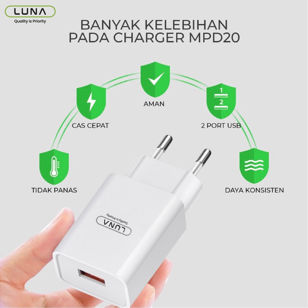 | Deskripsi | Specifications LUNA Kepala Charger Handphone USB 1 Port Free Cable Micro USB Travel Wall Adapter FREE CABLE DATA MICRO USB Fitur Utama: – Teknologi menawarkan kinerja pengisian daya lebih cepat dan stabil. – Dilengkapi chip pintar melindungi gawai Anda dari korslet dan over-charge. – Desain mungil dan ringan sehingga mudah dibawa. – Cocok untuk hampir semua gawai. – 【Safety Assurance】Approved for CE-FCC-RoHS certification. With its integrated circuit chip, identifies the charging state of the device and provides protection against over-charging, over current, and over-heating. Charging stops when the device’s battery is full. Safe to use. -【Universal & Portable】Lightweight and portable design is convenient to carrying for your international travel. It provides fast charging speed for your iPhone and other smartphones. You can place one in your office, home, and one for travel. High quality chargers can meet all of your demands. Plug Type: EU Plug Interface: 1 x USB Daya: 30W Input: AC 100-240V 50/60Hz 0.8A Warna Hitam 1 x Smart Charging Port: Output: 5V 1,5 A(max) Tipe: Wall Charger Berat paket: 0.096 kg Ukuran Produk (P x L x T): 5.50 x 4.50 x 2.80 cm / x x inches Ukuran Paket (P x L x T): x x cm / x x inches Isi paket: 1 x Charger |